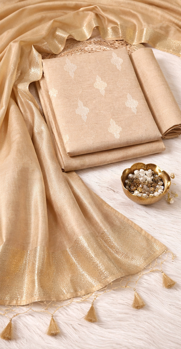 Bring understated elegance to your ethnic wardrobe with this beige linen unstitched suit fabric set, designed as part of an exclusive festive-season collection. Crafted for women who love soft tones with luxurious detailing, this ensemble blends breathable fabrics with timeless zari work.