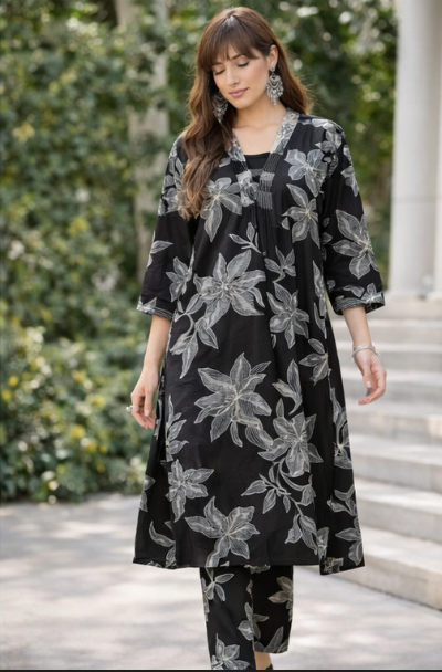 Add timeless elegance to your ethnic wardrobe with this beautiful black floral printed suit fabric for ladies. Designed with subtle white floral patterns on a rich black base, this fabric offers a sophisticated and modern look while retaining a classic ethnic charm.