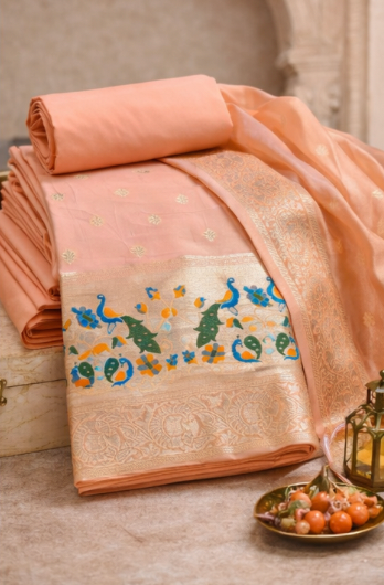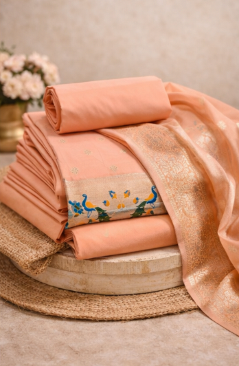 Blush Peach: Banarasi Silk Unstitched Suit with Gold Zari and Minakari Peacock Weaving