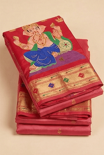 Exude traditional elegance in this coral pink pure silk Paithani saree. It features woven gold zari buttis throughout the body and a contrasting rich red pallu adorned with a magnificent traditional Lord Ganesha motif.