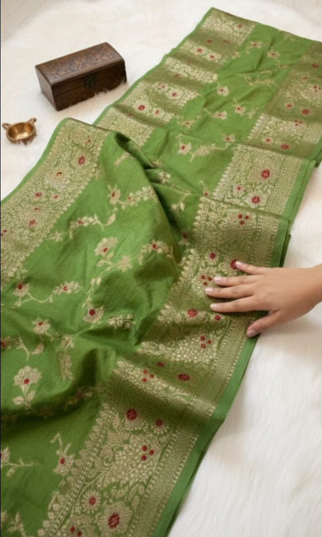 The lush green hue symbolizes prosperity and freshness, making it an ideal choice for weddings, festivals, pujas, and special occasions. The soft yet structured silk fabric drapes gracefully, offering both comfort and regal appeal throughout the day or evening. The intricate zari-style detailing reflects classic Banarasi artistry, giving the saree a refined and premium look.