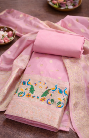 Our Subtle Lavender Banarasi Silk Suit Set offers the luxury of traditional Banarasi weaving in a sophisticated, modern color palette. This unstitched material is ideal for tailoring a custom-fit outfit for a premium look.