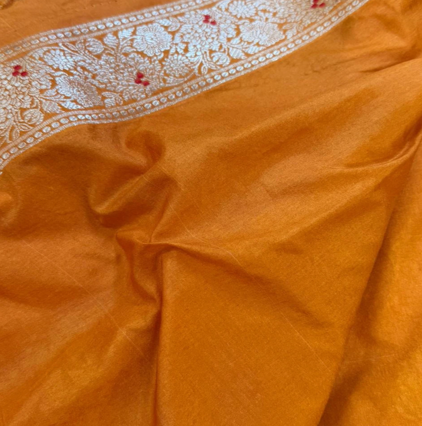 Bring home timeless elegance with this exquisite mustard yellow woven Banarasi silk saree, a perfect expression of traditional Indian craftsmanship. The saree features delicately woven floral motifs highlighted with subtle red accents, beautifully balanced across the body for a graceful and luxurious look.