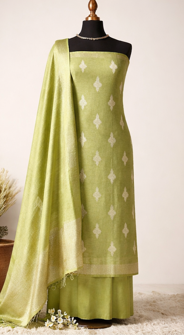 Refresh your ethnic wardrobe with this pista green linen unstitched suit fabric set, crafted as part of an exclusive Festive Season Linen Zari Collection. The soothing green tone paired with subtle zari detailing makes this set ideal for elegant daytime and festive occasions.