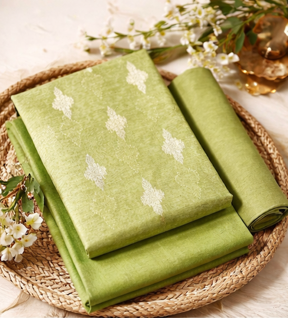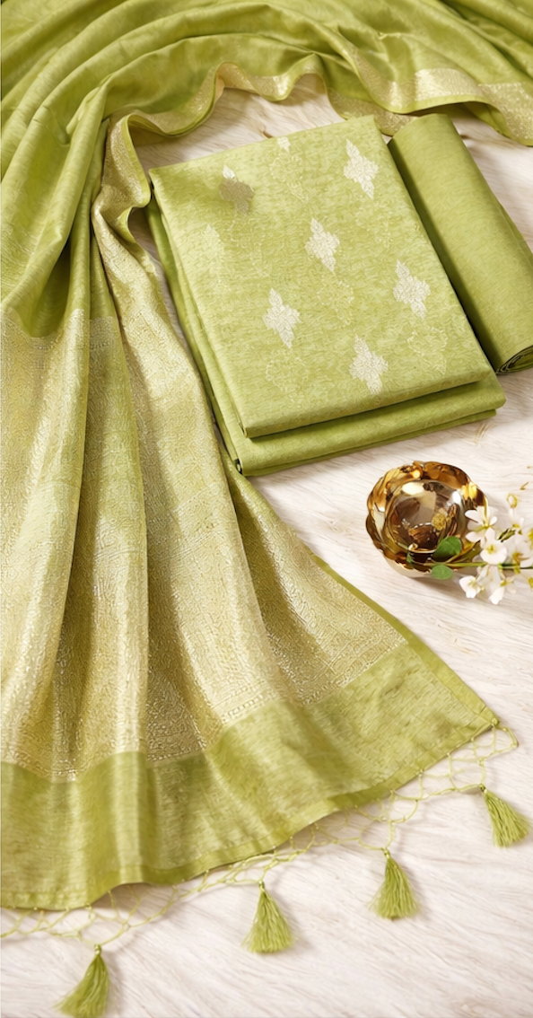 Pista Green Linen Zari Booti Unstitched Suit Fabric with Zari Border Dupatta