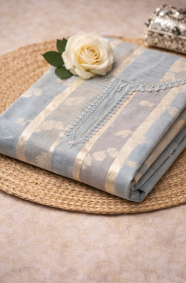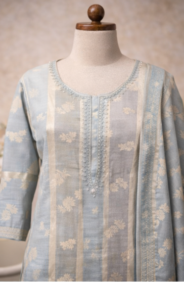 Product Overview: Embrace the charm of pastel hues with this Powder Blue Banarasi Georgette Suit Set. Designed for the modern woman who loves understated luxury, this ensemble combines lightweight fabric with rich traditional detailing.