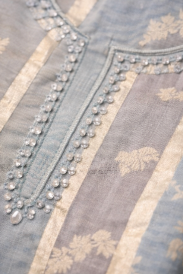Top (Kameez): Crafted from flowy, premium georgette or soft silk blend fabric in a soothing powder blue shade. The front features elegant vertical panels of intricate silver and light gold zari embroidery that elongates the silhouette. The neckline is finished with a refined embroidered placket.