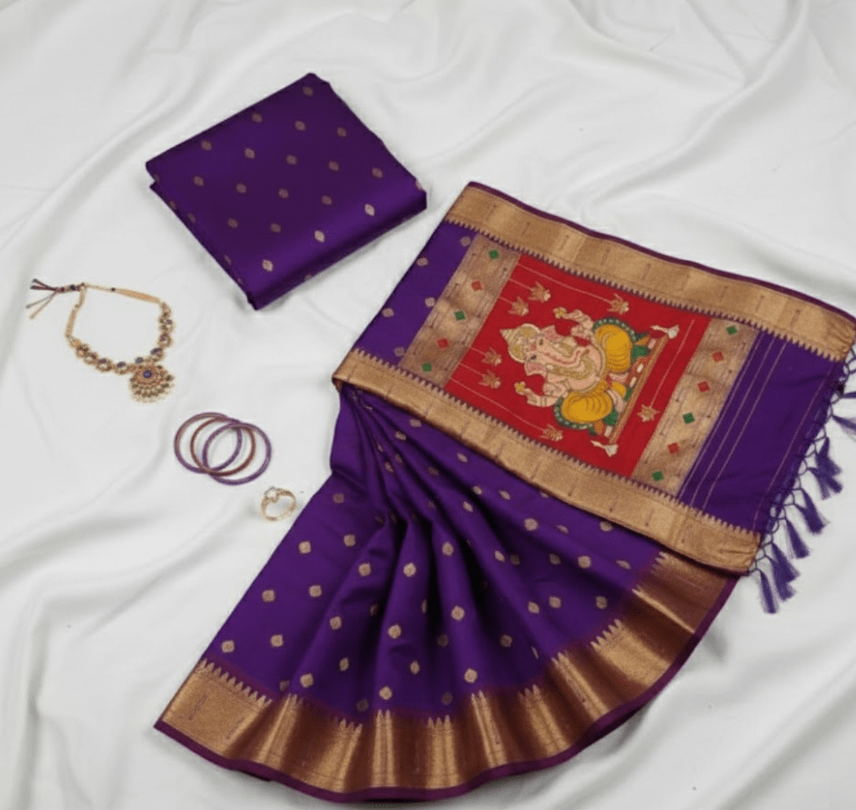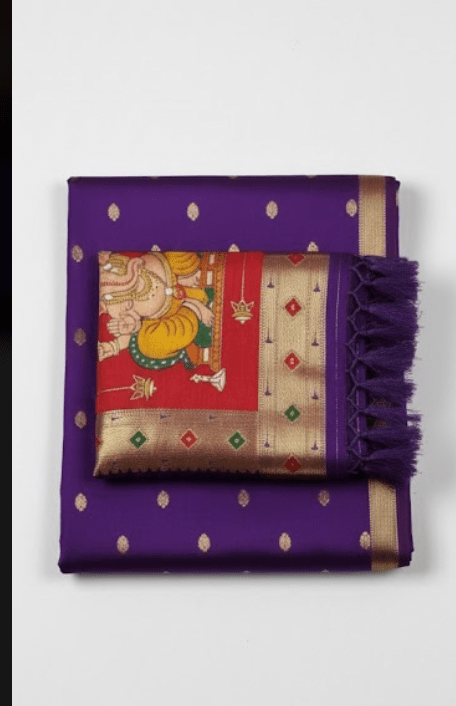 Embrace timeless tradition with this magnificent Regal Purple Pure Silk Paithani Saree. Handcrafted from luxurious pure silk, this saree is adorned with intricate gold zari polka dot bhuttis scattered across the body, lending it a subtle shimmer. The grand appeal is elevated by the broad gold zari border and the show-stopping red pallu, which showcases a meticulously woven, vibrantly colored traditional Lord Ganesha motif, symbolizing prosperity and new beginnings. Finished with delicate tassels, this saree is perfect for weddings, festivals, and special occasions, making you the center of attention.