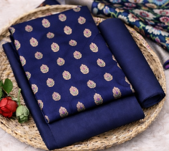 Royal Blue Banarasi Silk Unstitched Salwar Kameez with Floral Kimkhab Dupatta