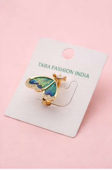 Add a touch of nature-inspired elegance to your jewelry collection with the Tara Fashion India Butterfly Enamel Ring. This exquisite piece features a beautifully detailed butterfly motif, meticulously hand-painted with high-quality green and blue enamel.