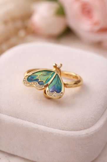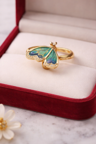 Unique Design: The butterfly wings feature a gradient of emerald green and deep blue, accented with delicate sparkling stones along the edges.