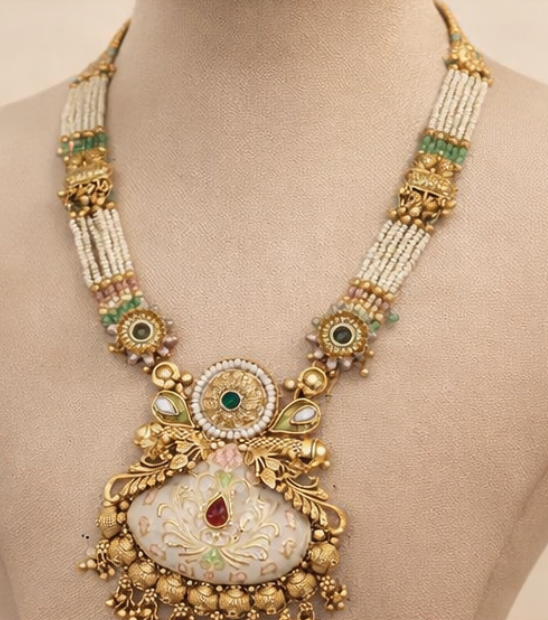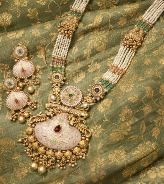 Embrace timeless elegance with this Traditional Meenakari Pearl Long Necklace Set, crafted to showcase refined Indian artistry and intricate detailing.