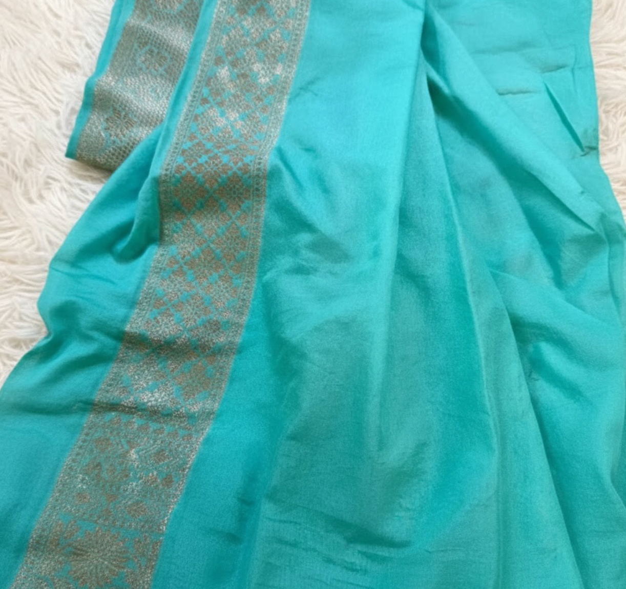 The refreshing turquoise blue shade offers a vibrant yet sophisticated appeal, making it a versatile choice for weddings, festive celebrations, receptions, and cultural gatherings. Crafted from premium silk, the fabric drapes effortlessly, giving a smooth, graceful fall while maintaining a rich and regal look.