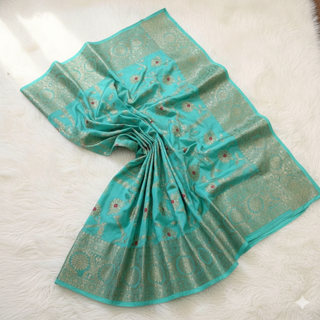 Elevate your ethnic wardrobe with this stunning turquoise blue woven Banarasi silk saree, a perfect blend of traditional craftsmanship and timeless elegance. The saree features finely woven floral motifs spread across the body, beautifully complemented by an intricate zari border that adds a luxurious finish.
