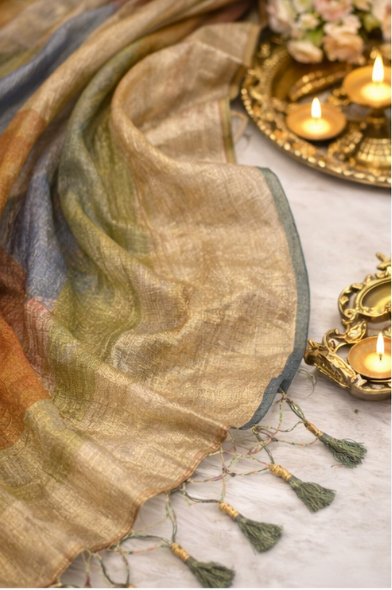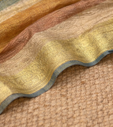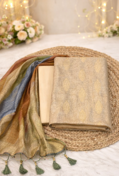This exclusive Banarasi unstitched salwar kameez set features a premium tissue silk top with elegant zari weaving that lends a refined festive sheen. The tissue silk dupatta is styled with graceful multicolor stripes dominated by blue tones, finished with zari woven borders for a rich yet airy drape.