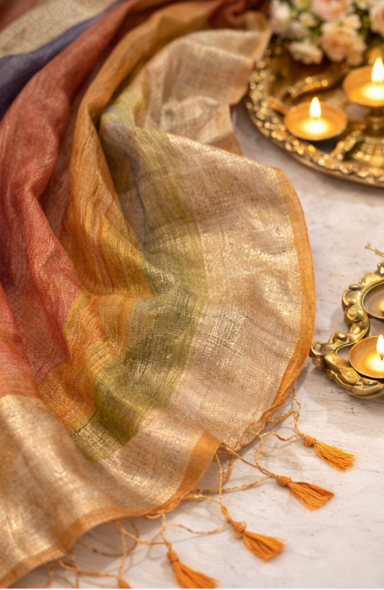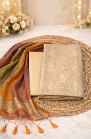Premium Banarasi unstitched salwar suit in tissue silk with zari weaving and designer multicolor dupatta.