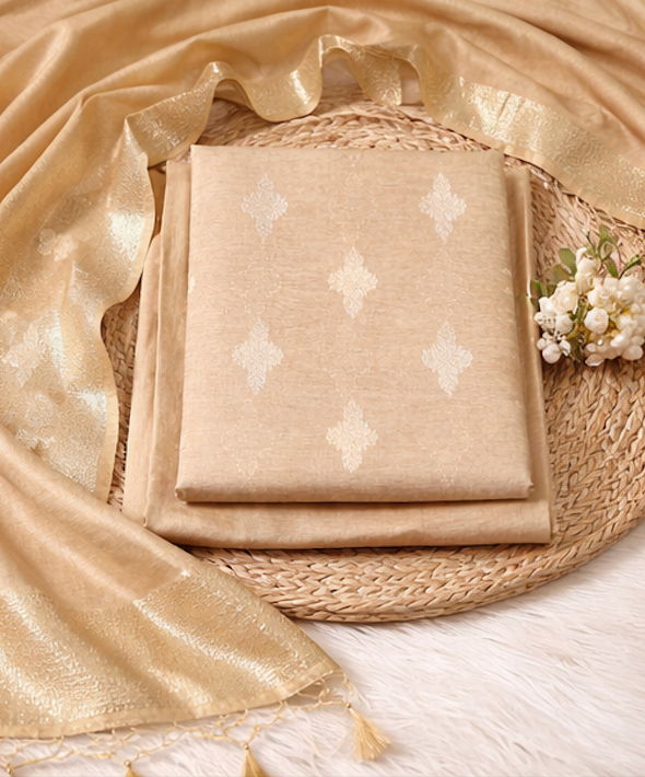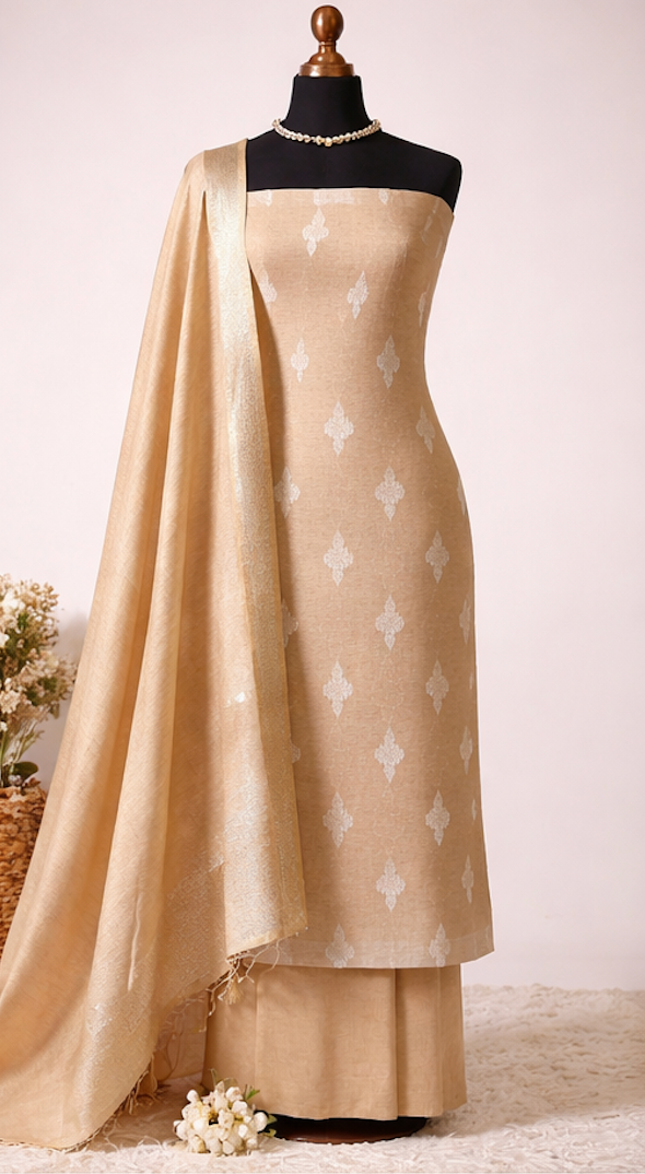 Bring understated elegance to your ethnic wardrobe with this beige linen unstitched suit fabric set, designed as part of an exclusive festive-season collection. Crafted for women who love soft tones with luxurious detailing, this ensemble blends breathable fabrics with timeless zari work.