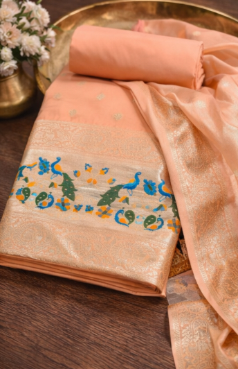 Blush Peach: Banarasi Silk Unstitched Suit with Gold Zari and Minakari Peacock Weaving