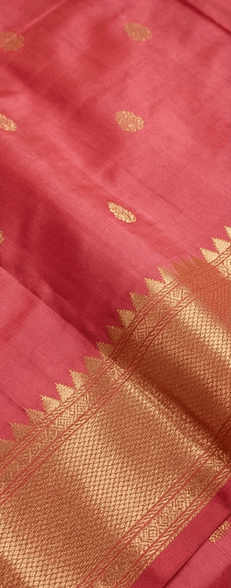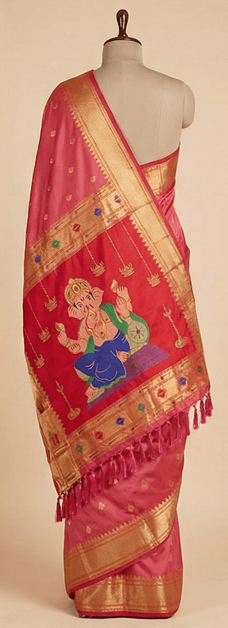 Exude traditional elegance in this coral pink pure silk Paithani saree. It features woven gold zari buttis throughout the body and a contrasting rich red pallu adorned with a magnificent traditional Lord Ganesha motif.