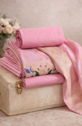 Our Subtle Lavender Banarasi Silk Suit Set offers the luxury of traditional Banarasi weaving in a sophisticated, modern color palette. This unstitched material is ideal for tailoring a custom-fit outfit for a premium look.