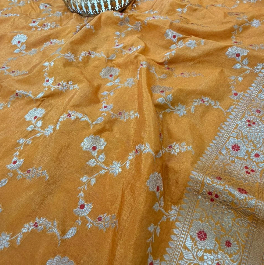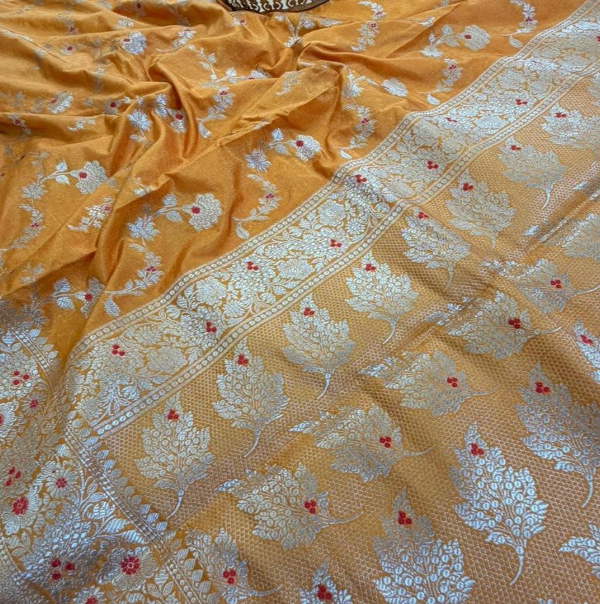 Bring home timeless elegance with this exquisite mustard yellow woven Banarasi silk saree, a perfect expression of traditional Indian craftsmanship. The saree features delicately woven floral motifs highlighted with subtle red accents, beautifully balanced across the body for a graceful and luxurious look.