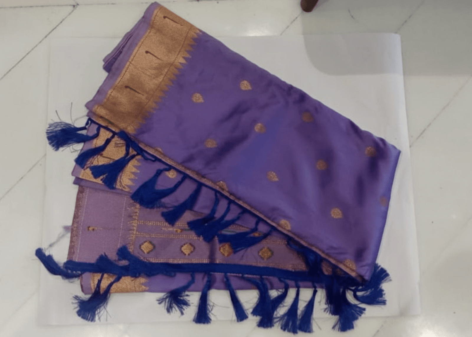 Embrace timeless tradition with this magnificent Regal Purple Pure Silk Paithani Saree. Handcrafted from luxurious pure silk, this saree is adorned with intricate gold zari polka dot bhuttis scattered across the body, lending it a subtle shimmer. The grand appeal is elevated by the broad gold zari border and the show-stopping red pallu, which showcases a meticulously woven, vibrantly colored traditional Lord Ganesha motif, symbolizing prosperity and new beginnings. Finished with delicate tassels, this saree is perfect for weddings, festivals, and special occasions, making you the center of attention.