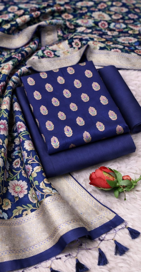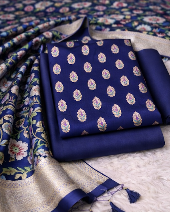 Royal Blue Banarasi Silk Unstitched Salwar Kameez with Floral Kimkhab Dupatta