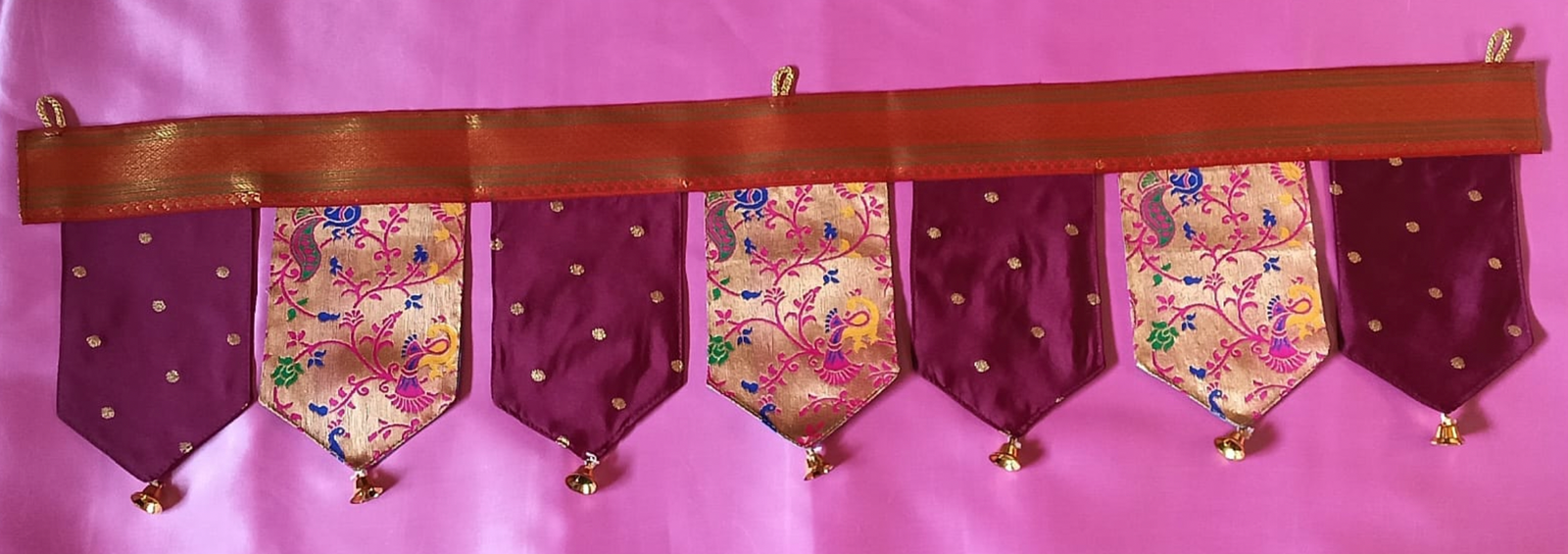 Traditional Paithani Design: The toran showcases classic "Mor" (Peacock) motifs woven into a rich gold and pink fabric, alternating with solid Royal Maroon panels.