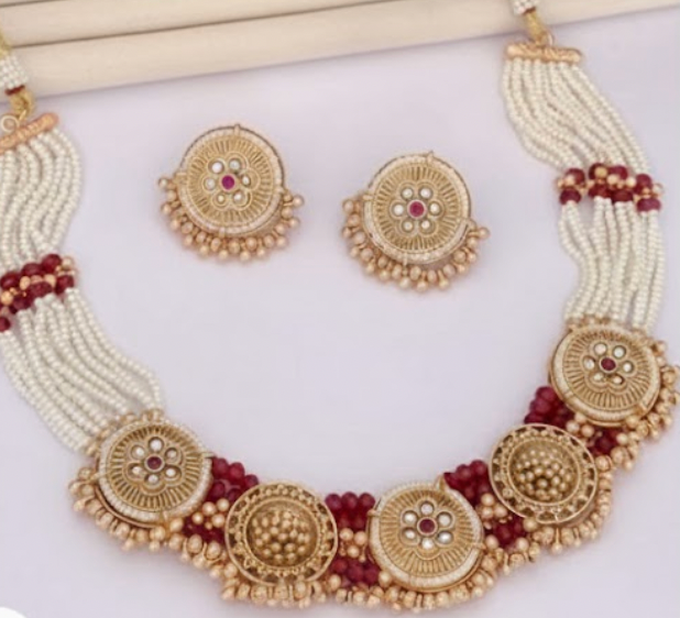 The necklace features multiple strands of fine pearls, beautifully accented with ruby-toned bead highlights and detailed circular kundan motifs in a rich gold finish. Each motif is crafted with precision, showcasing subtle stone detailing and textured gold elements that create a royal and graceful look.
